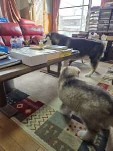 いよいよ、ミキちゃんが居間に来ましたブラック&ホワイトの美しい毛色h、kk父さんにそっくり穏やかで少し甘えん坊はモナ母さんかな?ご家族にご挨拶をして、妹分になる、凛母さんとマジック父さんの娘・・末っ子のナタリーちゃんとご挨拶・・ナタリーちゃんは姉妹の中では一番のビックサイズ生後50日目の体重は9,3kg・・二人とも堂々として仲良くしていました。